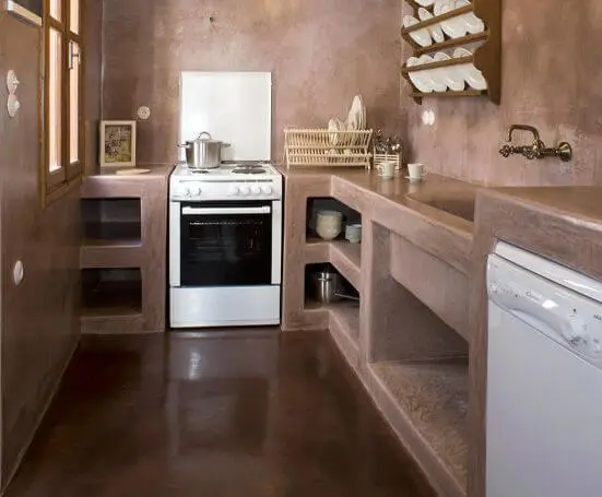 Os balcões podem levar diferentes tipos de acabamento: podem ser executados em concreto com acabamento de cimento queimado, podem receber ainda revestimento em porcelanato que imita mármore, mas que é absurdamente mais barato. E você ainda pode fazer a frente dos armários em madeira ou cortinas de tecido.